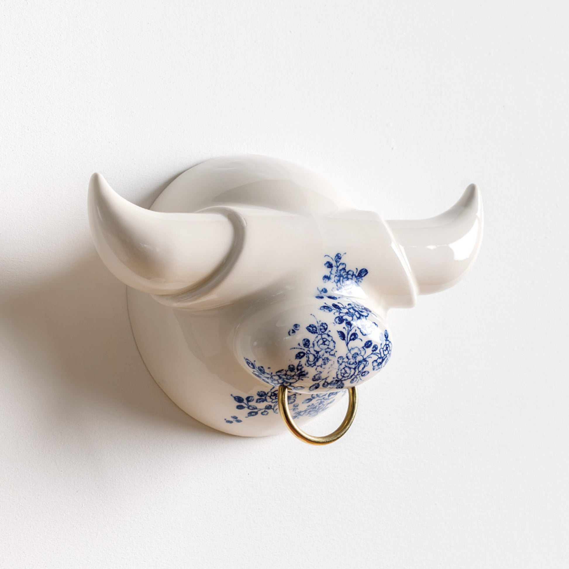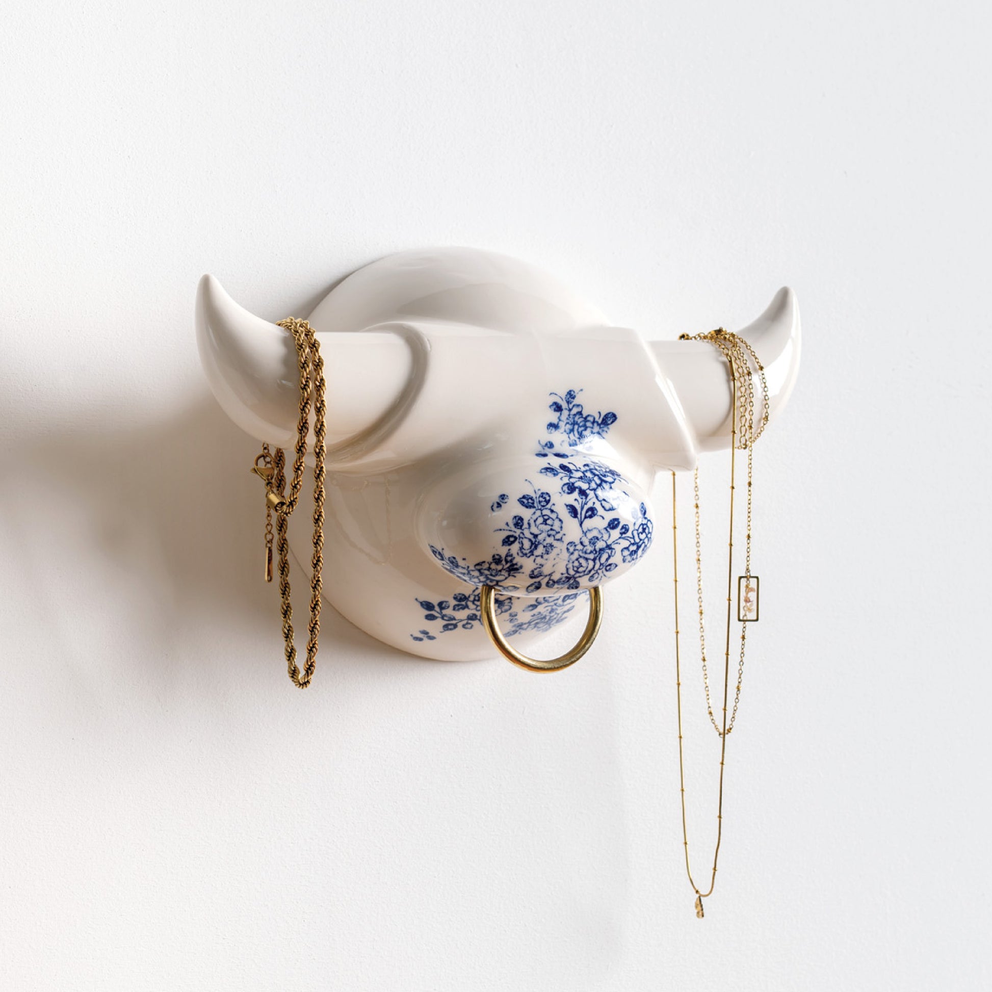 Glazed ceramic wall hook for jewelry and accessories. The horns offer space for hanging necklaces and bracelets. Mounts to the wall with two screws.