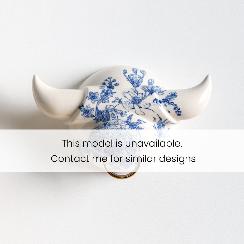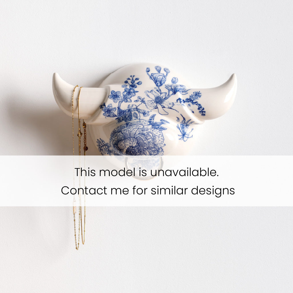 Glazed ceramic wall hook for jewelry and accessories. The horns offer space for hanging necklaces and bracelets. Mounts to the wall with two screws.