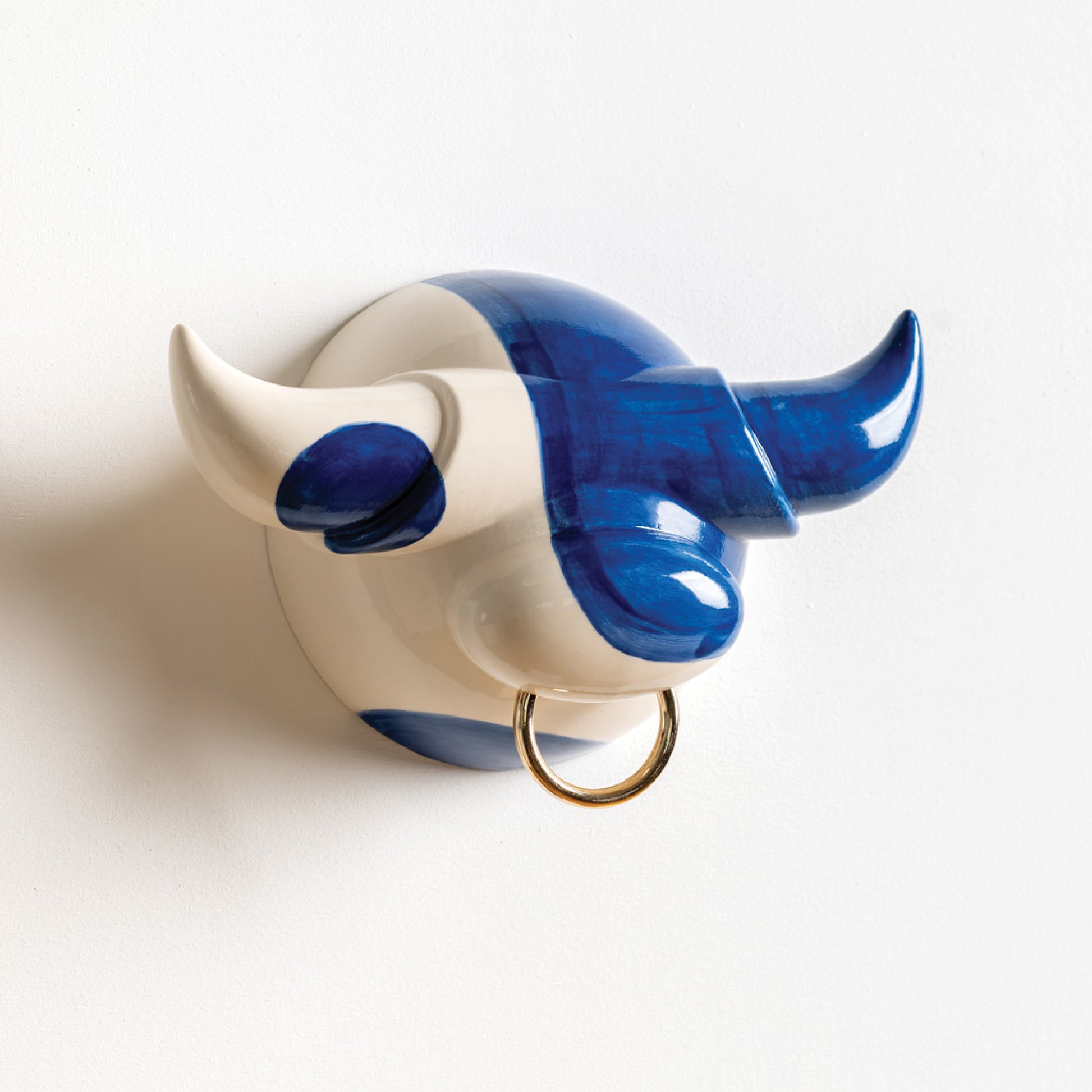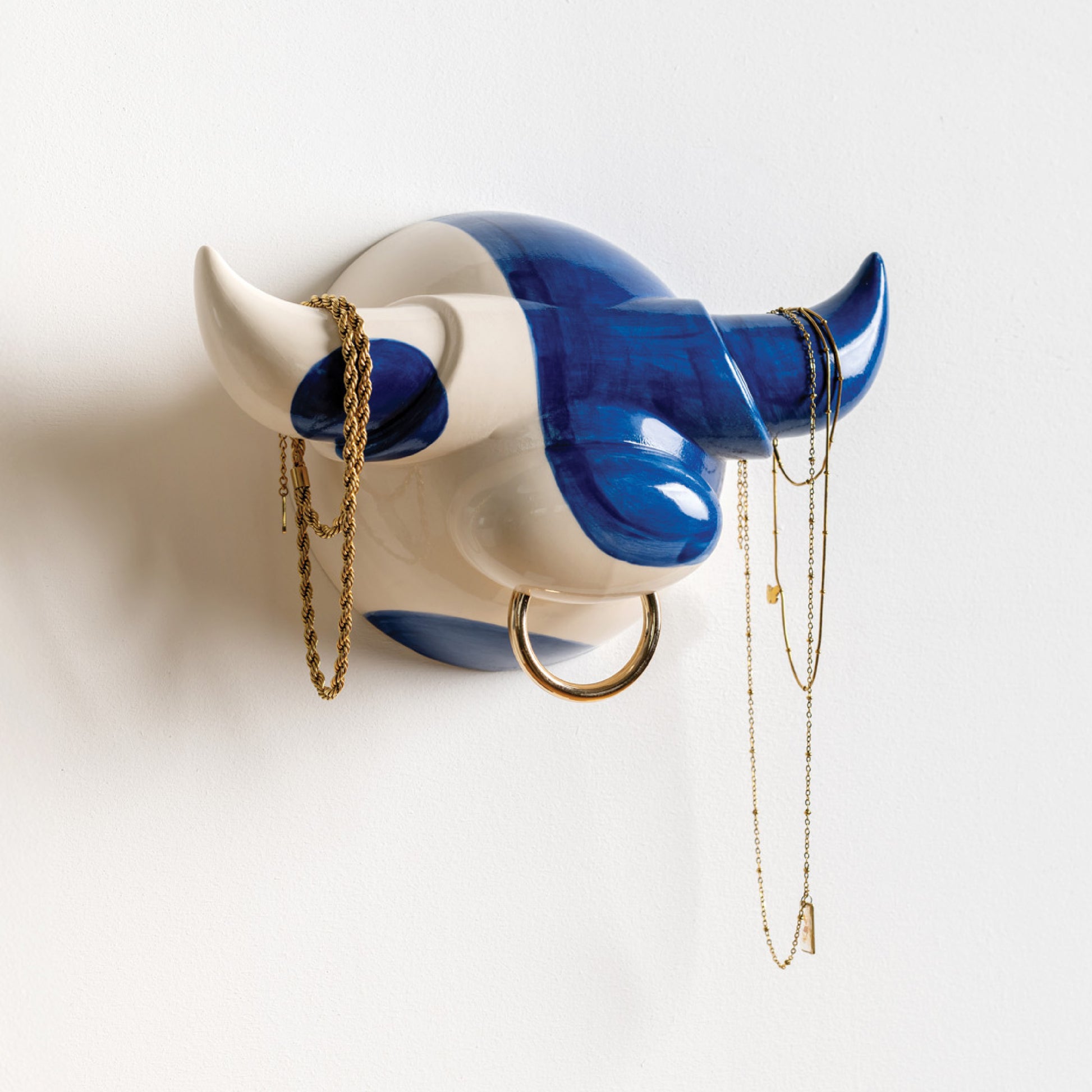 Glazed ceramic wall hook for jewelry and accessories. The horns offer space for hanging necklaces and bracelets. Mounts to the wall with two screws.