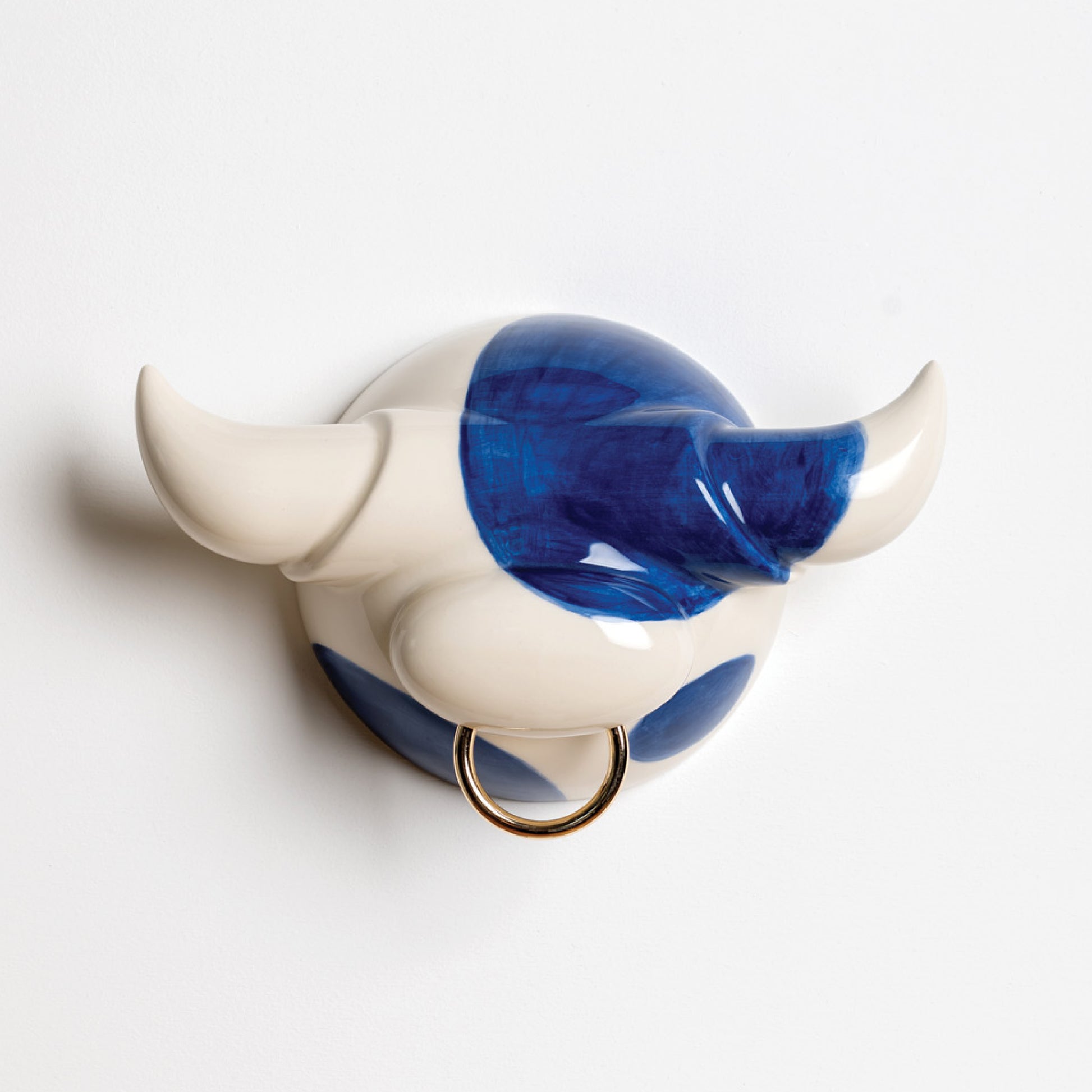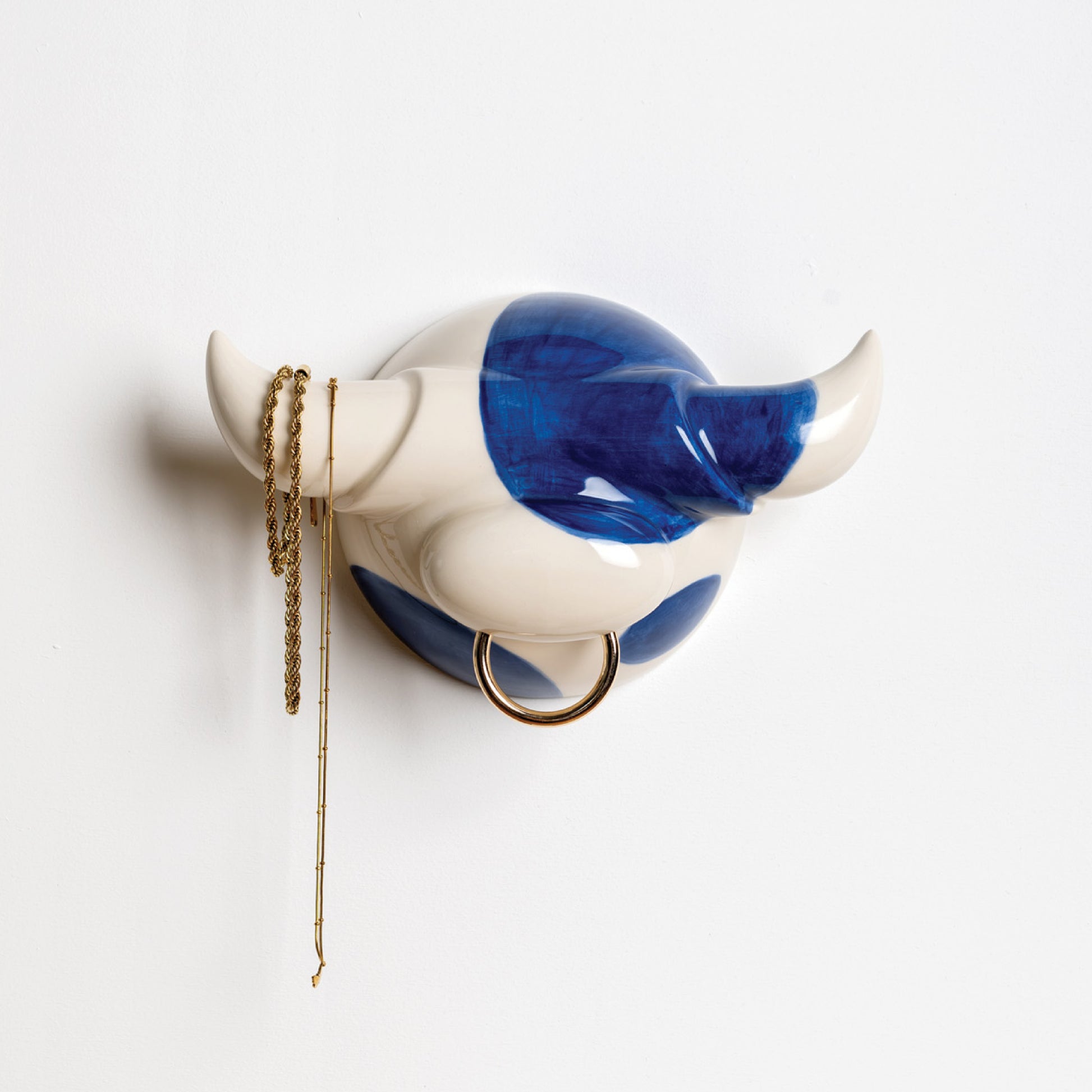 Glazed ceramic wall hook for jewelry and accessories. The horns offer space for hanging necklaces and bracelets. Mounts to the wall with two screws.