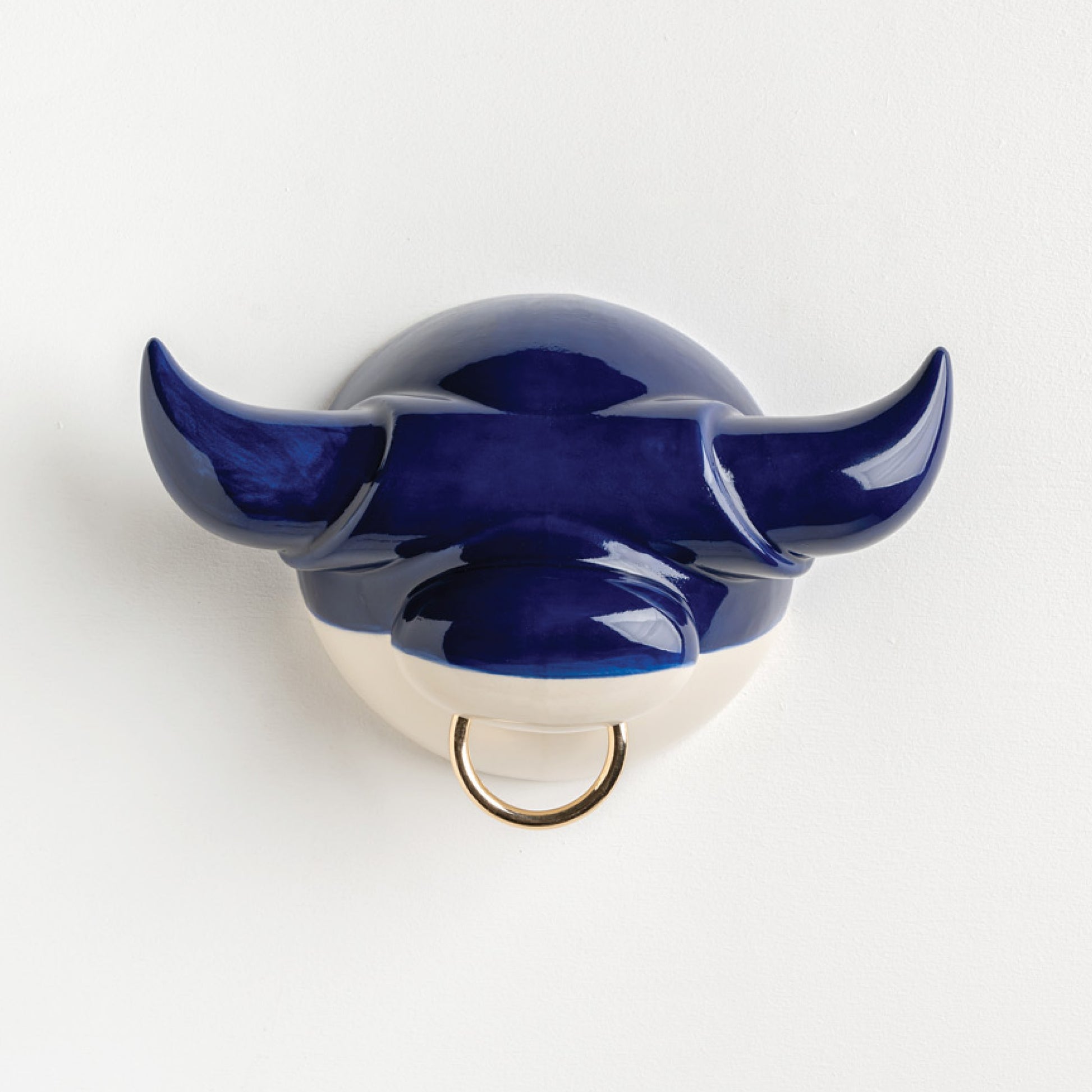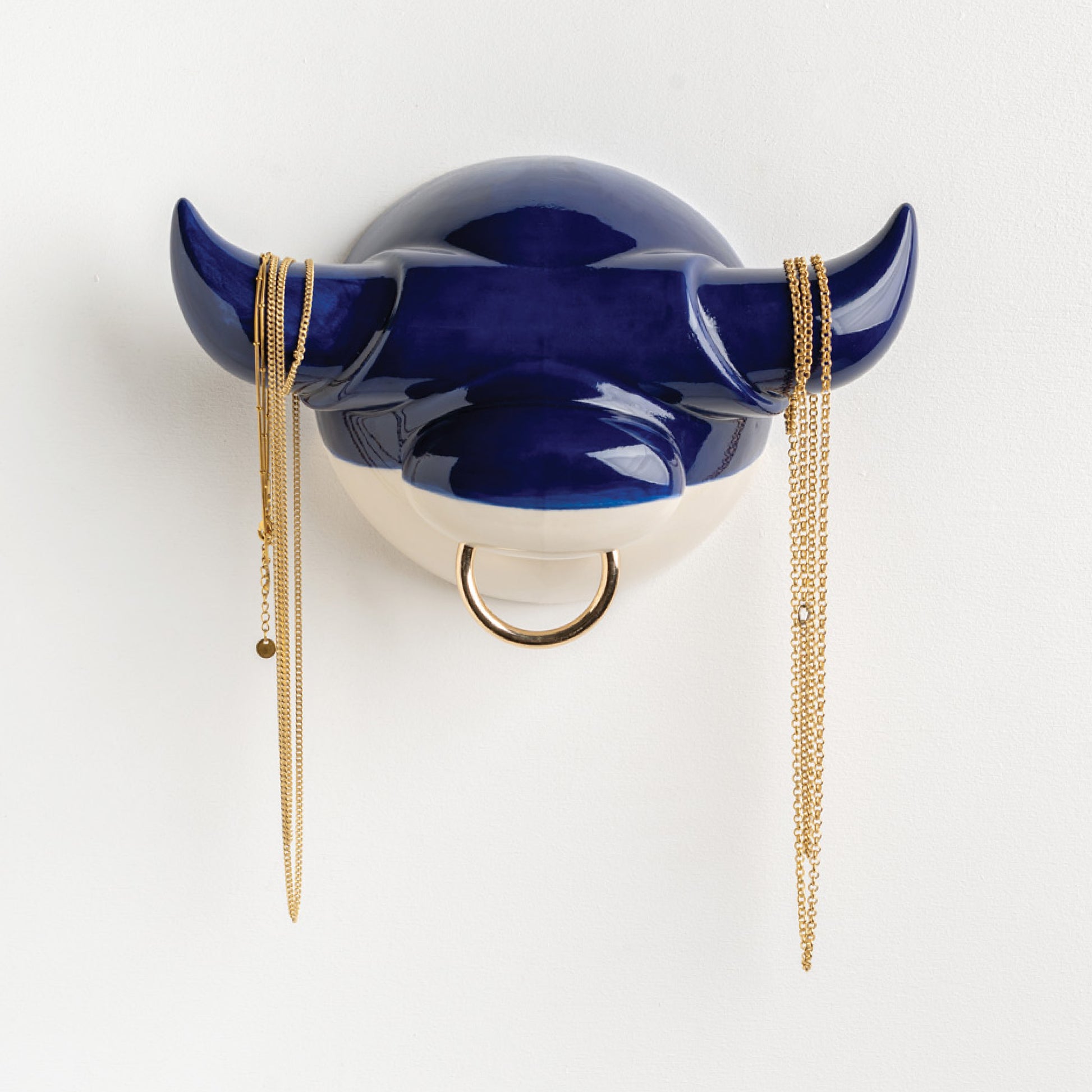 Glazed ceramic wall hook for jewelry and accessories. The horns offer space for hanging necklaces and bracelets. Mounts to the wall with two screws .