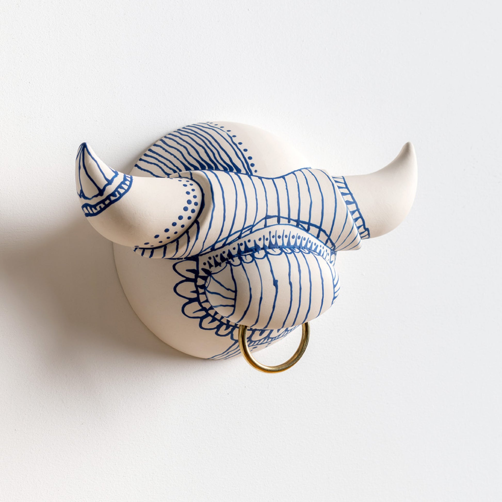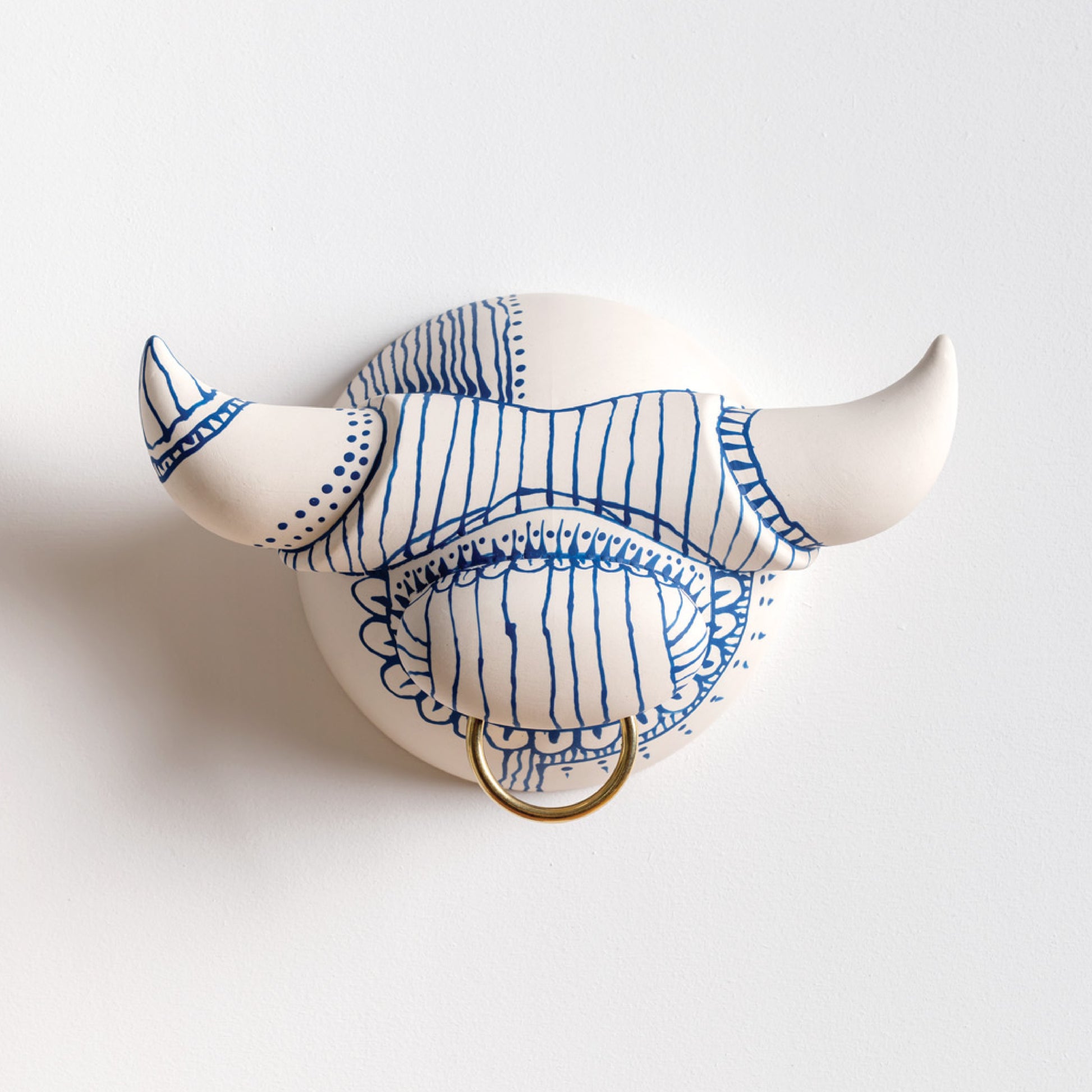 Ceramic wall-mounted piece for decorative display. Adds character and texture to any space. Mounts with two screws.