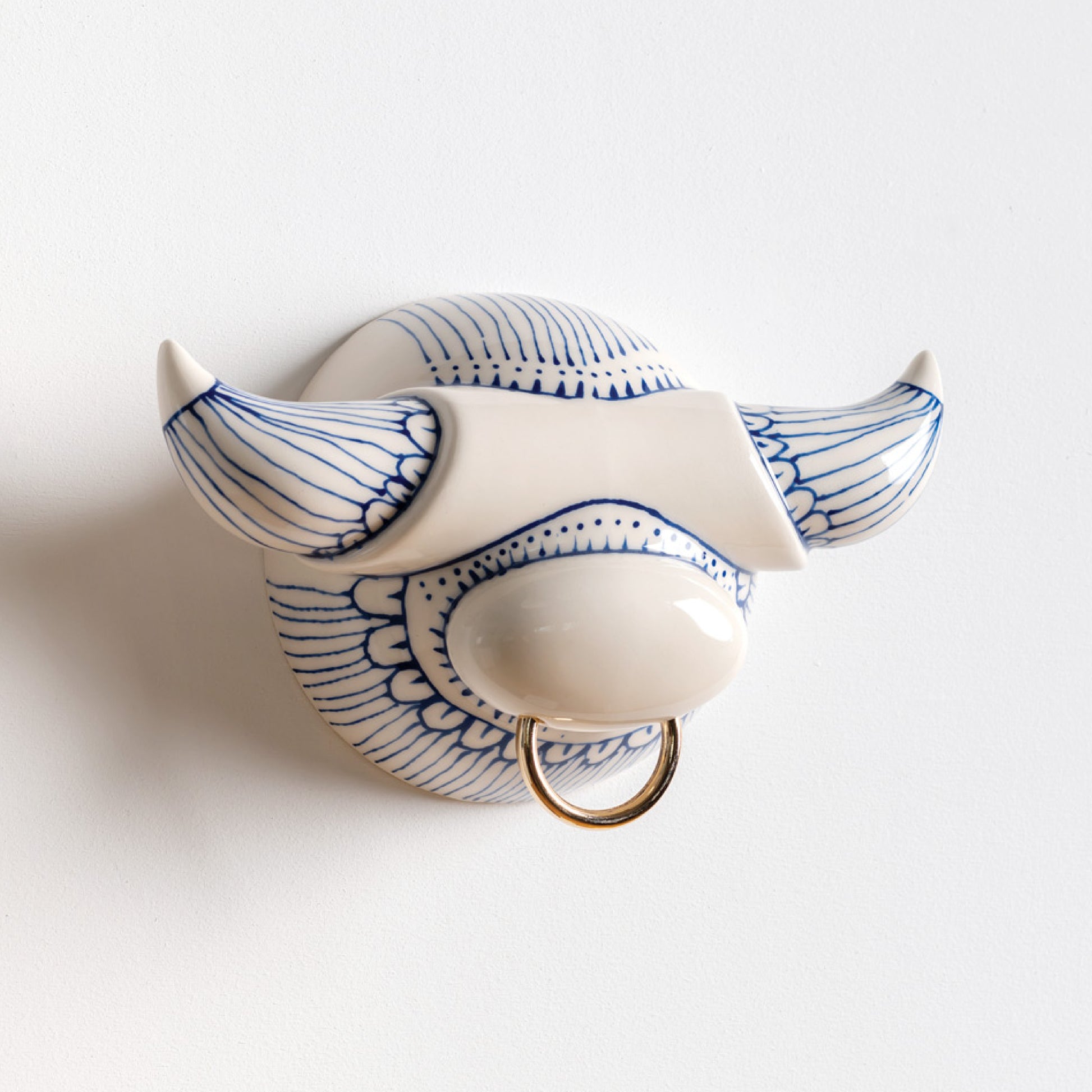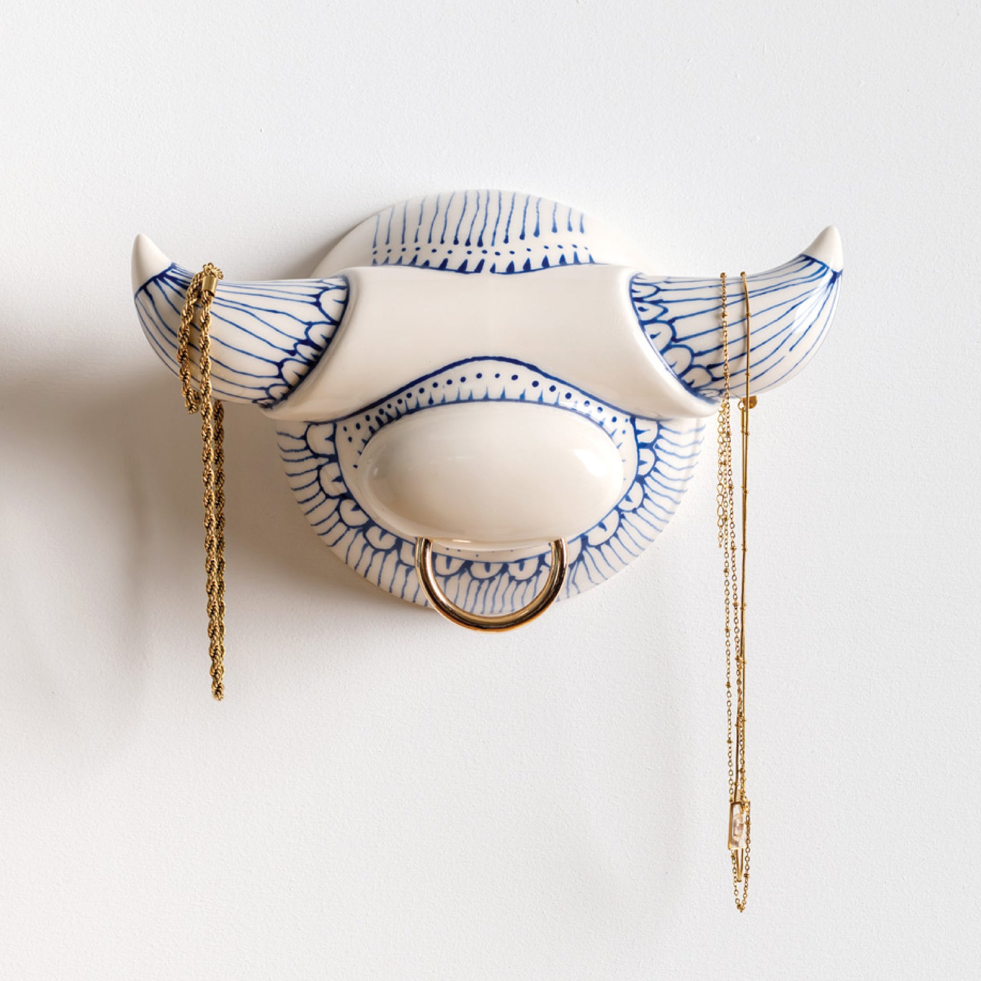 Glazed ceramic wall hook for jewelry and accessories. The horns offer space for hanging necklaces and bracelets. Mounts to the wall with two screws.