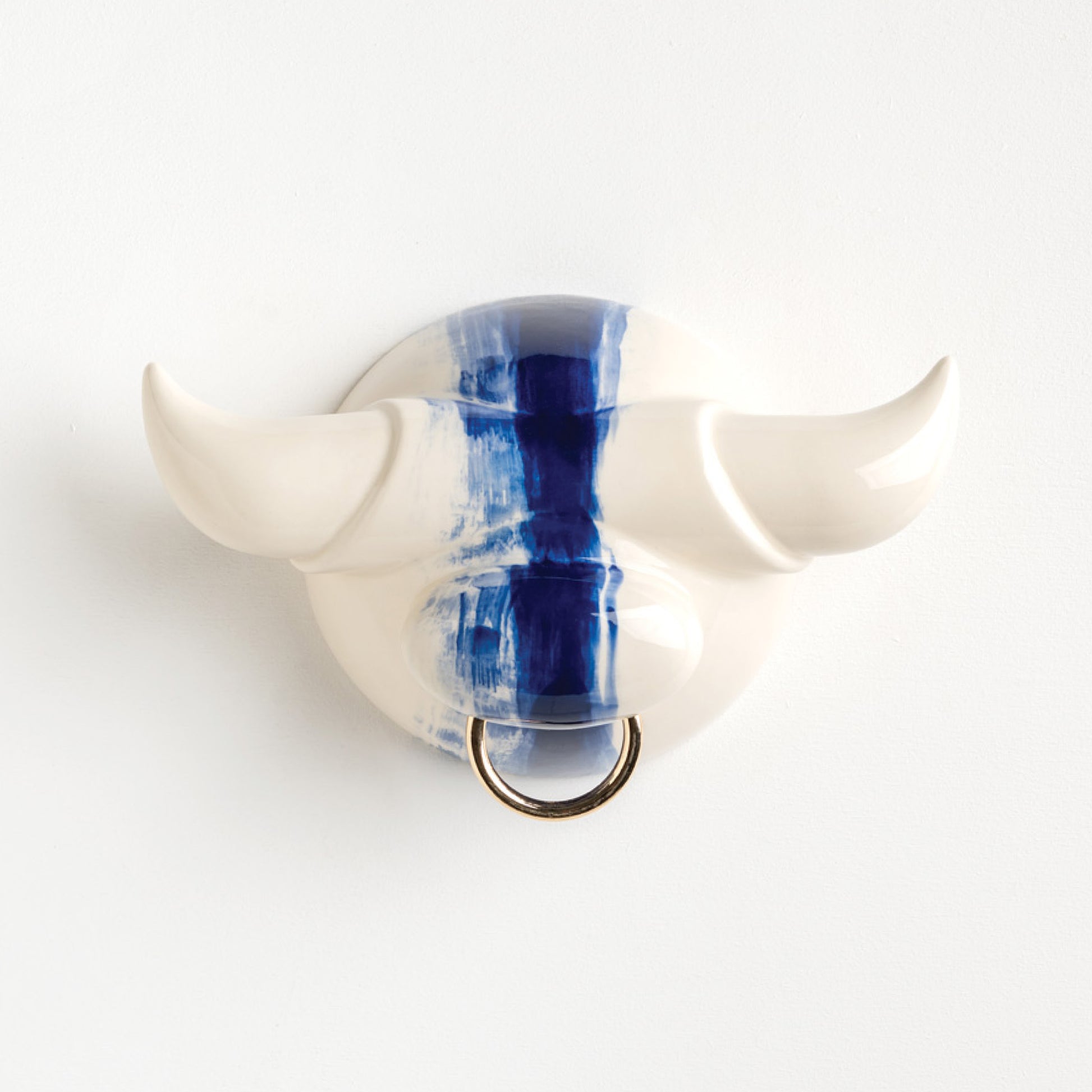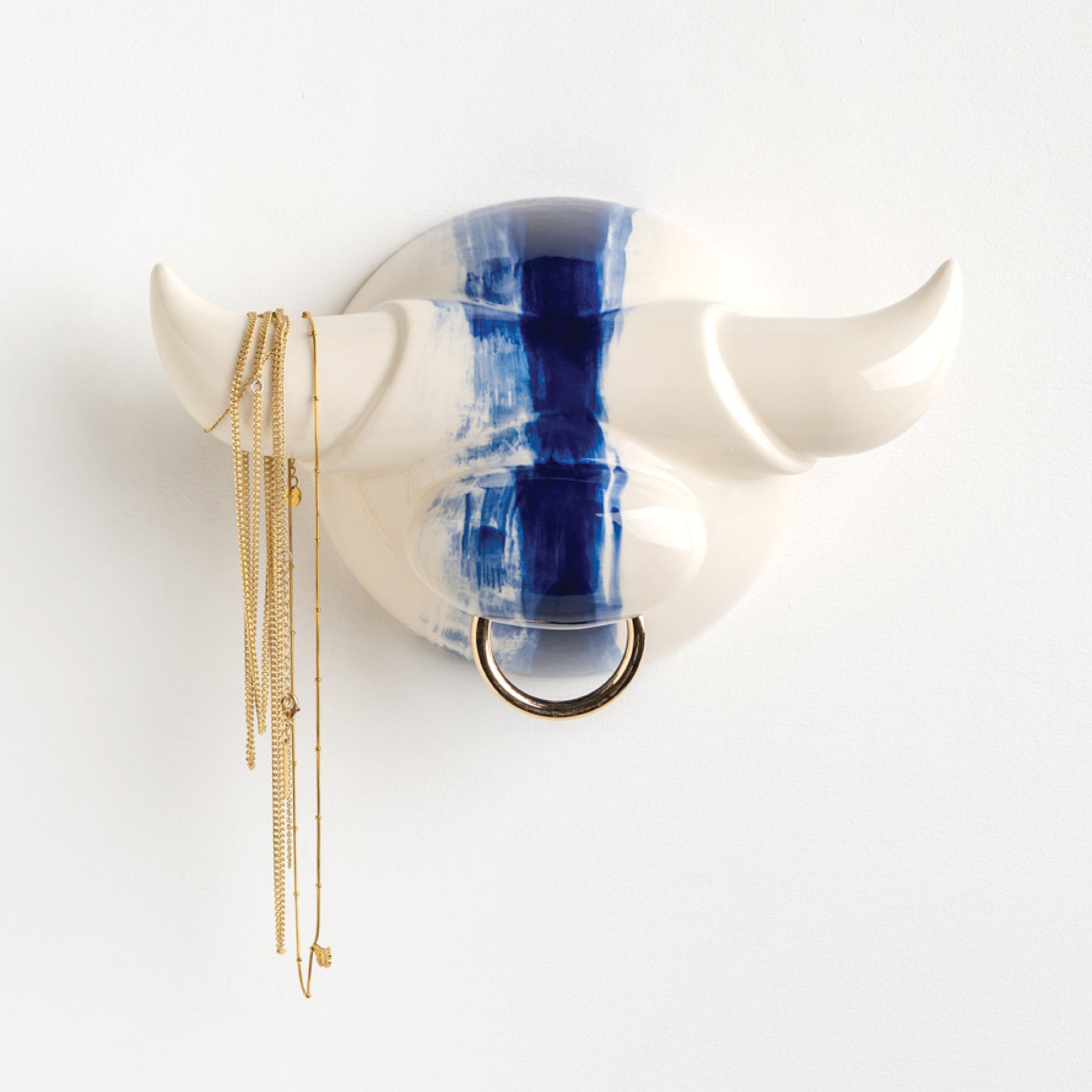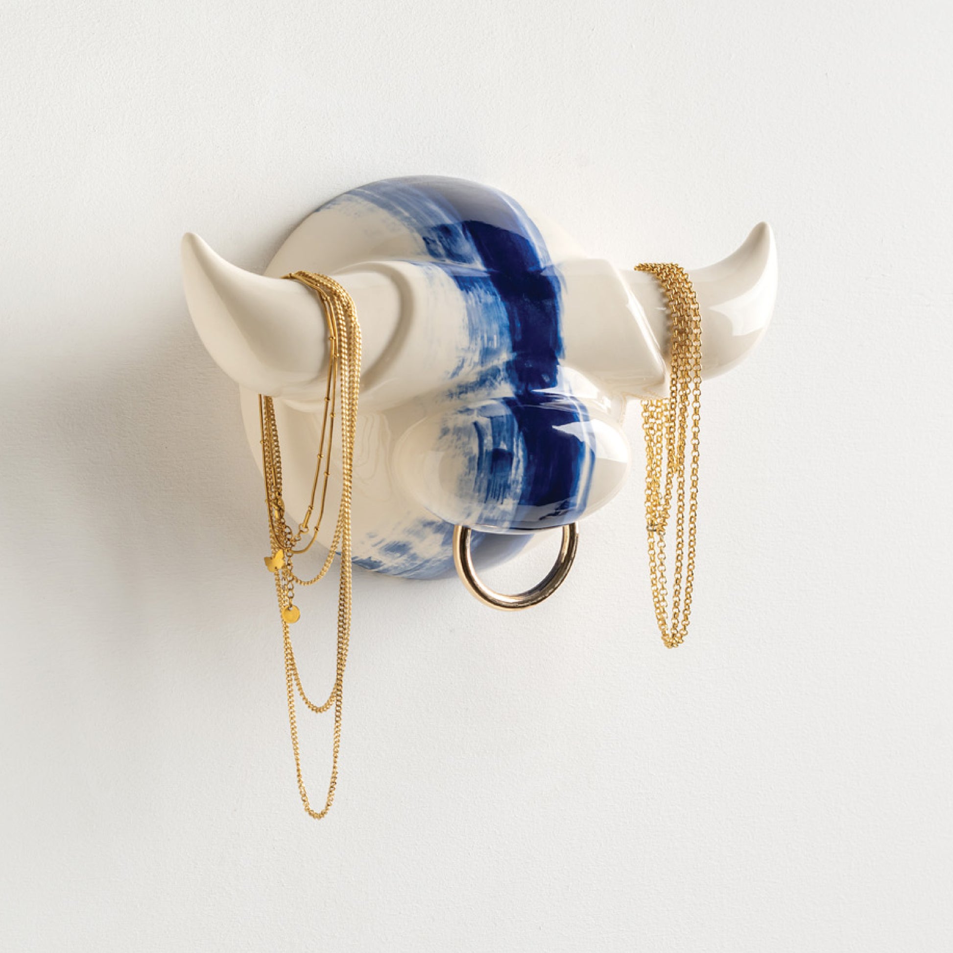 Glazed ceramic wall hook for jewelry and accessories. The horns offer space for hanging necklaces and bracelets. Mounts to the wall with two screws .